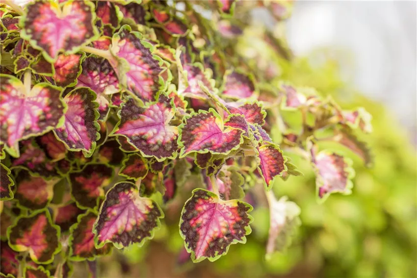 Coleus blumei 'Great Falls Angel' Zwischen den üppigen Flor passen nicht nur blühende Bindeglieder als Begleitpflanzen für Geranien. Da steht die große Welt der Gräser bereit. Zitronengras und Blauschwingel sind nur Beispiele. Aufrecht stehende oder geschmeidig überhängende Stängel, das ist Geschmackssache. Nun bleiben noch Bunt-Nesseln mit ihren individuellen Erscheinungsformen als Begleitpflanzen für Geranien und grüner Klee. Oder darf es noch etwas Besonderes sein? Da gibt es die wundervolle Schmuckblattgeranie mit ihren effektvollen Blättern. Die kleinen Blüten machen sich gegen den Flor der stehenden und hängenden Geranien recht bescheiden aus.